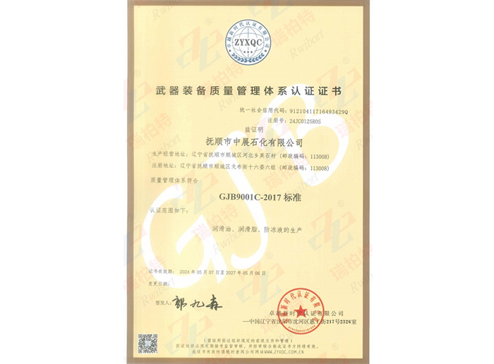 本公司是GB/T19001-2016/ISO 9001:2015標(biāo)準(zhǔn)質(zhì)量體系認(rèn)證單位(注冊(cè)號(hào):00922Q10664R1S),是GJB9001C-2017標(biāo)準(zhǔn)武器裝備質(zhì)量管理體系認(rèn)證單位。撫順在上個(gè)世際五十年代就已是我國(guó)軍用油脂的生產(chǎn)基地,本公司正在發(fā)揚(yáng)和繼承這一優(yōu)良傳統(tǒng),全力投入于各種軍用、航空油脂的生產(chǎn)與研發(fā)。